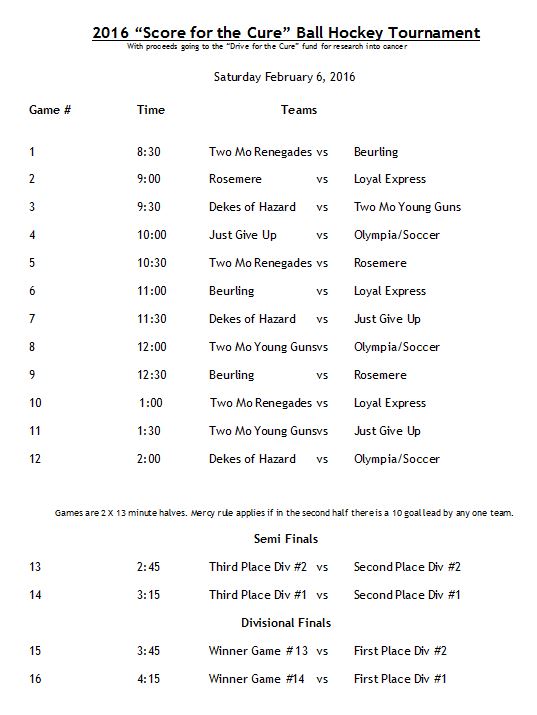 6 Score for the Cure Ball Hockey Tournament Schedule |