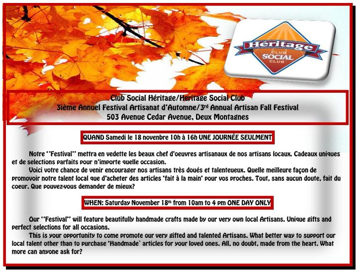 18 Artisans Fall Festival Heritage Social Club 10am to 2pm Details ---- High School Fundraiser Spaghetti Supper Details |