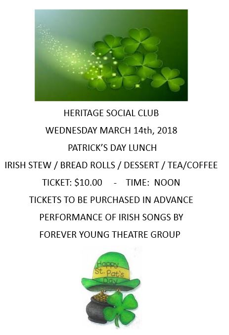 14 Irish Lunch Heritage Social Club Noon - $10.00 Tickets MUST be purchased in advance Details |