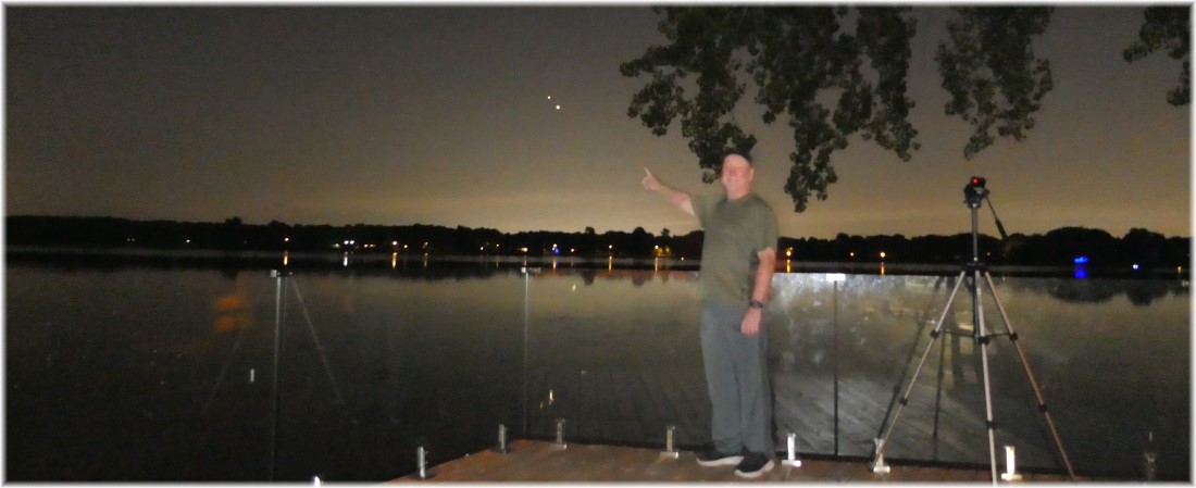 There is however something coming up very soon that might be worth getting up early for. Venus, the brightest object in the sky and Jupiter, our solar system's largest planet will rise together in the east-northeast and will only be about 1 degree apart. That's about the width of 2 moons. They are actually fairly close right now but the closest will be on August 12th. After that, they will slowly drift apart. In the next week or so, they will only be visible from around 3am to around 5:30am since after that the sun takes over the sky. To boot, August 12th is supposed to be the peak of the Perseids meteor shower. The next few days are also high in probability of aurora borealis because the sun's been acting up. Note -The graphic on the right does amplify the actual size of the planets but is only for you to find those planets among the stars. Weather permitting, I will probably be at our new Centennial park platform to view Venus and Jupiter rising at 3am on August 12th. Imagine if the 'stars' line up and give us a Trifecta of the planets, the meteor shower and the northern lights. It's highly unlikely, but let social media hype this one. Update- As you see in the above picture, the conjunction of Venus and Jupiter happened as predicted and the sky cooperated. Granted we are very far away from a dark sky area. This view is looking over Laval West beach from the Centennial park platform. I didn't see any of the Perseids meteor shower and forget the northern lights as they peaked a few days ago and didn't quite make it this far south. It was a beautiful warm morning at around 24 degrees. I only wore long pants in case of bugs but there weren't any. In case you are sorry you missed this event, you can still get another look tomorrow morning between 3am and 5am. Jupiter will rise first and Venus will be just under it a few minutes later. Not quite as close but close enough to see that Venus is orbiting faster than the distant Jupiter. To put it into perspective, Venus is about 183 million kilometers away from us now while Jupiter is about 714 million.