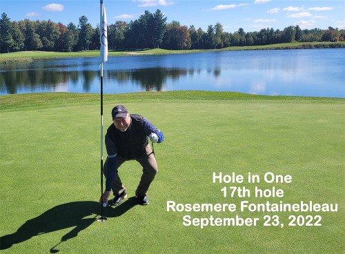 On Friday September 23rd, I was playing golf with new clubs that I had received on Thursday. I played Thursday afternoon with them and I liked them. On Fridays, I play in a small group of 20 to 24 players. Fridays are also crossover days so half of the golfers start on the 10th hole. That was the case for us, so when I got to the 17th hole (our 8th hole), it was quite windy. Normally, I would have clubbed down to compensate for the head wind but my new clubs seemed to be hitting the ball further. I used my 6 iron, to carry the ball over the bunkers and the ball bounced once and rolled close to the hole. I stopped looking at it before it disappeared being content that I had made it to the green. My playing partner said it had gone in but I wasn't convinced until I went to look for it in the hole. It was my 3rd Hole-In-One. The first one was at Glendale in 1998 but I couldn't really brag about it since I was playing in the morning before coming in late for work. I had one last year on the 13th hole at Rosemere but I was playing with 3 member I didn't really know and it started to rain on the 15th hole and they all stopped playing. Part of our membership includes hole-in-one insurance as the tradition that a golfer who aces a hole must pay the round at the bar after his round. At our club, the insurance covers drinks for your foursome and other people in the bar. They were happy that I got my hole-in-one.