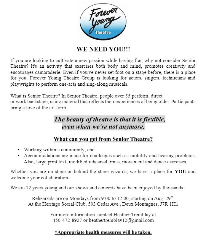 Forever Young Theatre Needs You!!! If you are looking to cultivate a new passion while having fun, why not consider Senior Theatre? It's an activity that exercises both body and mind, promotes creativity and encourages camaraderie. Even if you've never set foot on a stage before, there is a place for you. The Forever Young Theatre Group is looking for actors, singers, technicians and playwrights to perform one-act plays and sing-along musicals. What is Senior Theatre? In Senior Theatre, people over 55 perform, direct or work backstage, using material that reflects their experiences of being older. Participants bring a love of the art form. Rehearsals are on Mondays from 9:00 to 12:00, starting on Aug. 29th, at the Heritage Social Club, 503 Cedar Ave. Deux-Montagnes. For more information, contact Heather Tremblay at 450-472-8927 or heathertremblay12@gmail.com. Click here for all the info. Forever Young Theatre turned 10 years old during the Pandemic. Here is a short recap of the shows they performed during those 10 years.