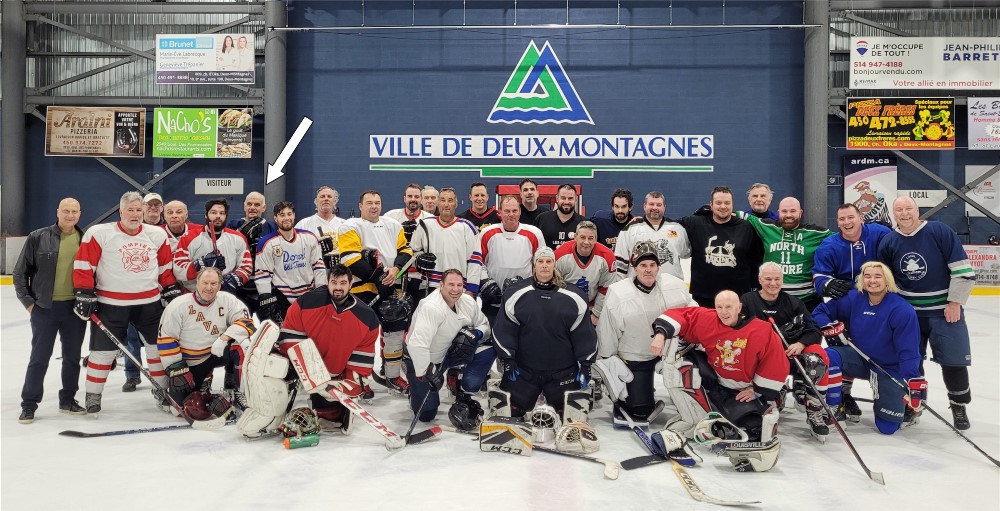 grandfather to Ariana. Click here to view his online obituary. L.T.H.C. Closes Out Its 50th Season The Laval Teachers' Hockey League was first established in 1973 when a few teachers, mostly from Laval Catholic High School used some free ice time to get out and play some pick up hockey. Since many of those teachers were from the Two-Mountains area, as time went on, more local people joined in. One of the original players, Ron Fitzmorris, (under arrow), is still playing and is in charge of getting replacement players when needed. On Monday April 11th, we played our last Monday game of the season at the Olympia Arena. Traditionally, for our final game of Monday hockey, we invite players that have filled in throughout the year which is why there are more than our regular 22 players in the picture. The game was followed by a few beverages and pizza. The 2022-23 season will start again on Monday September 12th. We play from 2:30pm to 4:00pm. The LTHC also plays Fridays from 5pm to 6pm at the renovated private arena (Complexe Sportif AP formerly Patinoire Deux-Montagnes). That season ends on April 29th. If you are old and interested in joining us for some friendly competition on the ice, we can make room for your talents. There is a permanent to 'league' on the left side of this page.