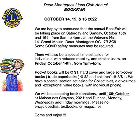 The Lions Club book fair will be held on Saturday and Sunday, October 2nd and 3rd, 2021 from 8:00 am to 5:00 pm. As usual we will have a pre sale for individuals with mobility issues, i.e. needing assistance from wheelchairs, walkers and canes. Caretakers with babies in strollers are also very welcome on Friday October 1 from 1:00 pm to 4:00 pm.. The location of the sale will be the Veterans Hall 141 Grand Moulin, Deux-Montagnes. Que J7R-3C8. We are keeping the prices reasonable so that everybody can enjoy this sale. Pocket books will be 75 cents. Hard covers or large soft covers $ 2.00 and children’s books will be 3 for $ 1.00. There will also be a section with, collectables, with prices as marked.. DVD's and CD's will also be on sale at that time. We do accept books for this sale. Books can be dropped of at the Maison des Citoyens, 202 Henri Dunant on Mondays, Wednesdays and Fridays from 8:30 to 11:30. All books in good condition will be accepted , with the exception of Magazines and encyclopaedias.