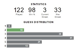Let Me Have A Wordle With You There are a lot of strategies on the best first word to use but I find that starting with the same word every day is boring and it takes some of the game play away. I try to use a different word every day to start. Today I got lucky for the 10th time and guessed the word in 2 tries but as you can see in the graphic, I mostly guess in 4 tries. I have missed completely 3 times, hence my 98% win percentage. Since late April, I have also tried to take screen shots of my attempts. I have them posted in an album that is online at this link. Spoiler Alert! Today's word (July 12th) is there so don't look unless you've already played. Although, I said I try to use a different starting word every day, I see that I have used to same word a few times. For example, for some strange reason have used the word TOWER 3 times with not much success. If you do start playing this daily habit, I have a suggestion. In the settings (the gear thing on the top right), choose Hard Mode. This will prevent you from not using a letter you already know is in the solution. That way you won't waste an attempt. If you do get addicted to this game, don't blame me for wasting 5 minutes of your day. Oh yes, here is the link to game. Wordle.