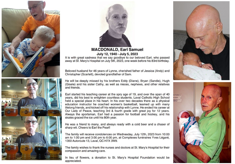 heart disease. He is finally at peace. A celebration of life will be held at the Heritage Social Club, 503 Cedar street, Deux-Montagnes on Saturday September 9th, 2023 from 1pm to 5pm. Please click here to access his Montreal Gazette obituary and guestbook.