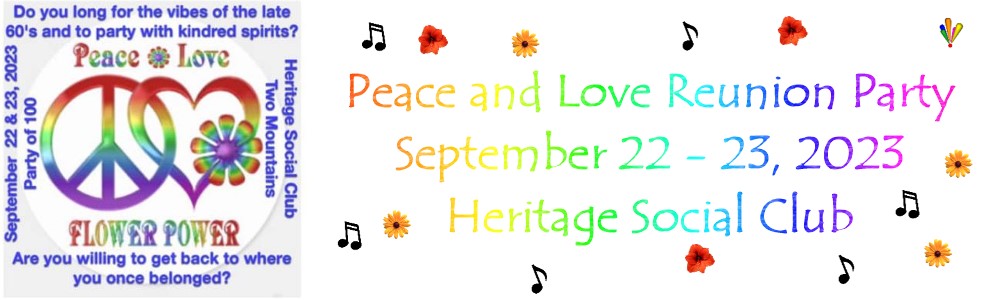 (casual attire). Can't make it to the Peace and Love Two-Mountains Reunion? The big reunion that is less than 3 weeks in the planning has over 60 confirmed attendees. It's only 2 weeks away and many of you needed more time to make room for the event. There is time to register and it's only 25 bucks. We are limited to 100 attendees because of the hall size. Send an e-transfer to 2mtns.peaceandlove@gmail.com and you are automatically registered. If you can't make it, we would still love to hear from you. How about sending a short video saying hello to the gang? Even just a picture, with a message. How about an old picture that we could show on the big screen. If you have any of these things, you can simply use this link and upload it. UPDATE - We now have 85 attendees, so we are almost sold out. Send us your e-transfer before it's too late and the hall's capacity is reached.