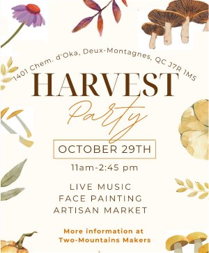 The Two-Mountains Makers are holding a 'Harvest Party' on Sunday October 29th from 11am to 2:45pm at Lilianne Music School at 1401 Oka Road. At the event, there will be live music by Ecole de musique Lilianne and the lovely Silka Weil at 11-2pm. Alongside, there will be tours the whole day of the dynamic music school. Children's activities include face painting/henna, a pumpkin decorating station by Pimp my pumpkin - Deux-Montagnes, and an art activity by L’Atelier Café Arts et Céramique. ALL ACTIVITIES ARE FREE OF CHARGE. On site there will be an artisan market full of local makers selling seasonal wares. We are especially excited for InTerreArt Osbl, a community agriculture organization, who will give a talk about the benefits of native plants and host a medicinal plant giveaway. Supplies are limited. The Lions Club will also be selling their famous fruit cakes at this event. Click here for all the info of the event.